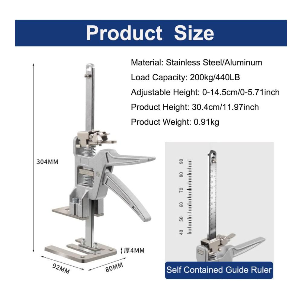 – Material: Edelstahl/Aluminium – Tragkraft: 200 kg. – Höhenverstellbar: 0–14,5 cm. – Produktgröße: 9,2 x 8,0 x 30,4 cm. – Produktgewicht: 0,91 kg. – Paketgewicht (zwei): 2,1 kg. – Verpackungsgröße (zwei): 35 x 25 x 10 cm. Lieferumfang: – 1/2 x arbeitssparender Arm Bitte beachten Sie, dass die tatsächliche Farbe aufgrund von Monitor- und Lichteffekten leicht vom Bild abweichen kann. Bitte erlauben Sie eine Abweichung von 5-7 mm aufgrund der manuellen Messung. Erleben Sie die Leichtigkeit und Effizienz unseres Türbrett-Hebers für alle Ihre Hebe- und Installationsbedürfnisse. Bestellen Sie jetzt und vereinfachen Sie Ihre Projekte noch heute!