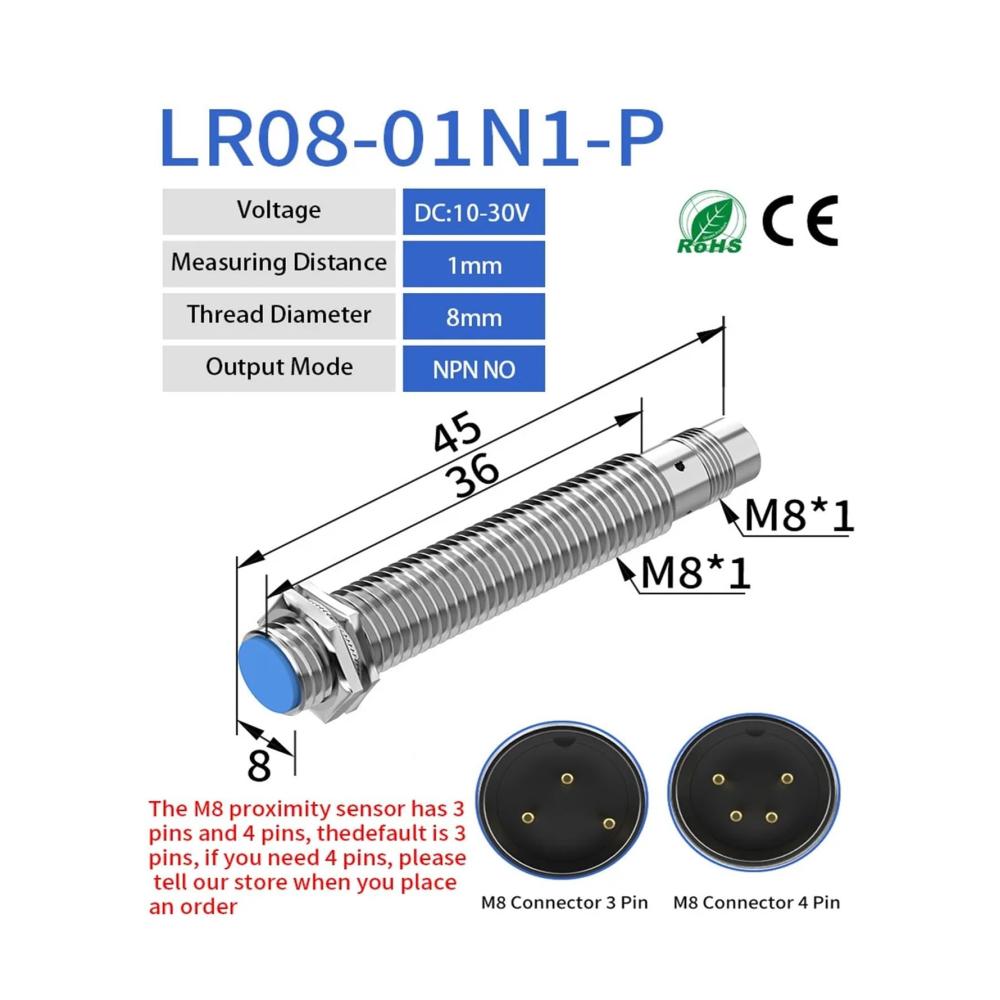 Fotoelektrische SensorenInduktiver Näherungsschalter-Sensoranschluss, steckbar, M8-Serie, 3-polig, 4-polig, bündig, NPN, PNP, Schaltabstand 2 mm, 1 mm, 6–36 V DC