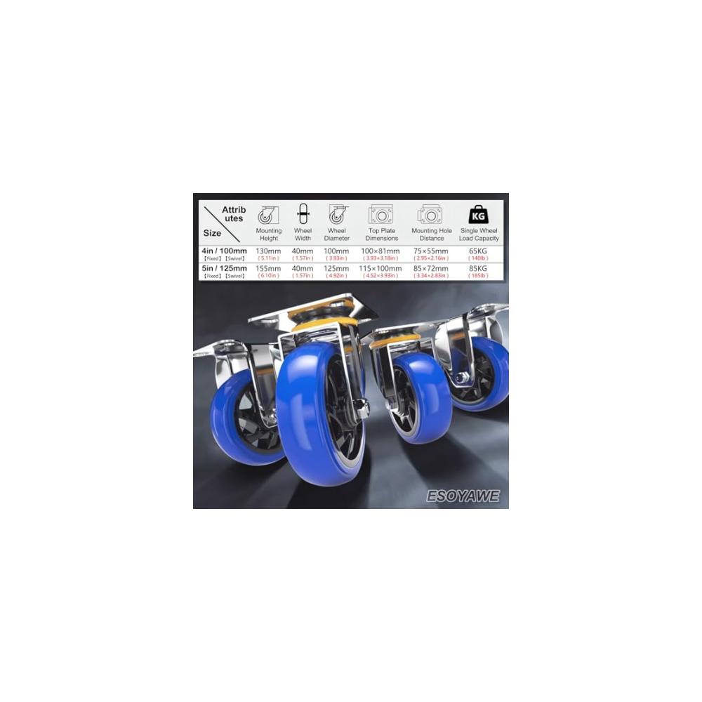 【4er-Rollenset】 Raddurchmesser: 100/125 mm; Radbreite: 40 mm; Montagehöhe: 130/155 mm; Größe der oberen Platte: 100 x 81 mm / 115 x 100 mm; Montagelochabstand: 75 × 55 mm / 85 × 72 mm