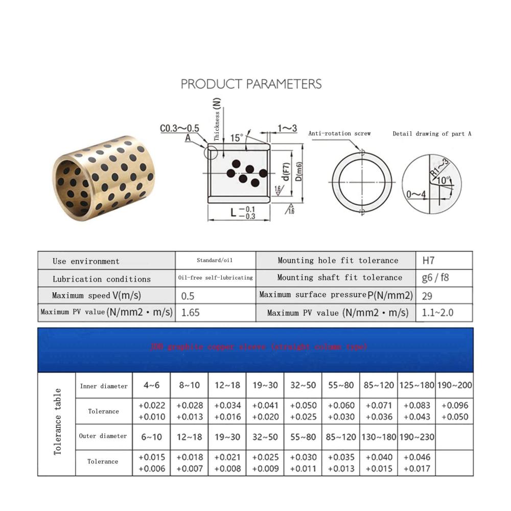 Detail: Ölfreie, selbstschmierende Graphit-Kupfer-BuchsenMaterial: hochfestes Messing (CuZn24A16)Größe: ID*OD*L (Innendurchmesser x Außendurchmesser x Länge)Merkmal: Ölfrei, selbstschmierendMerkmal: TragenMerkmal: Hohe TemperaturMerkmal: WartungsfreiMerkmal: Präzise Toleranzen