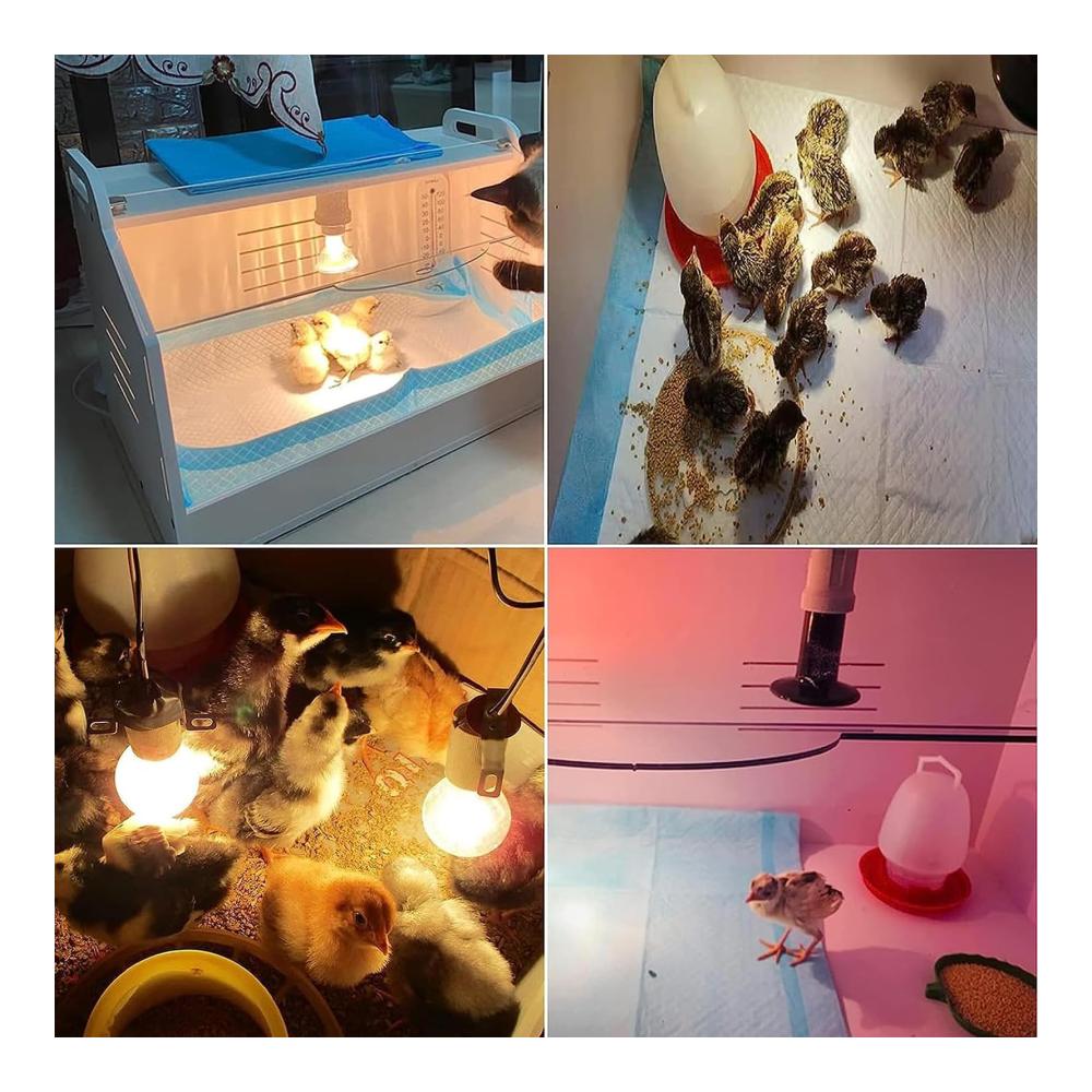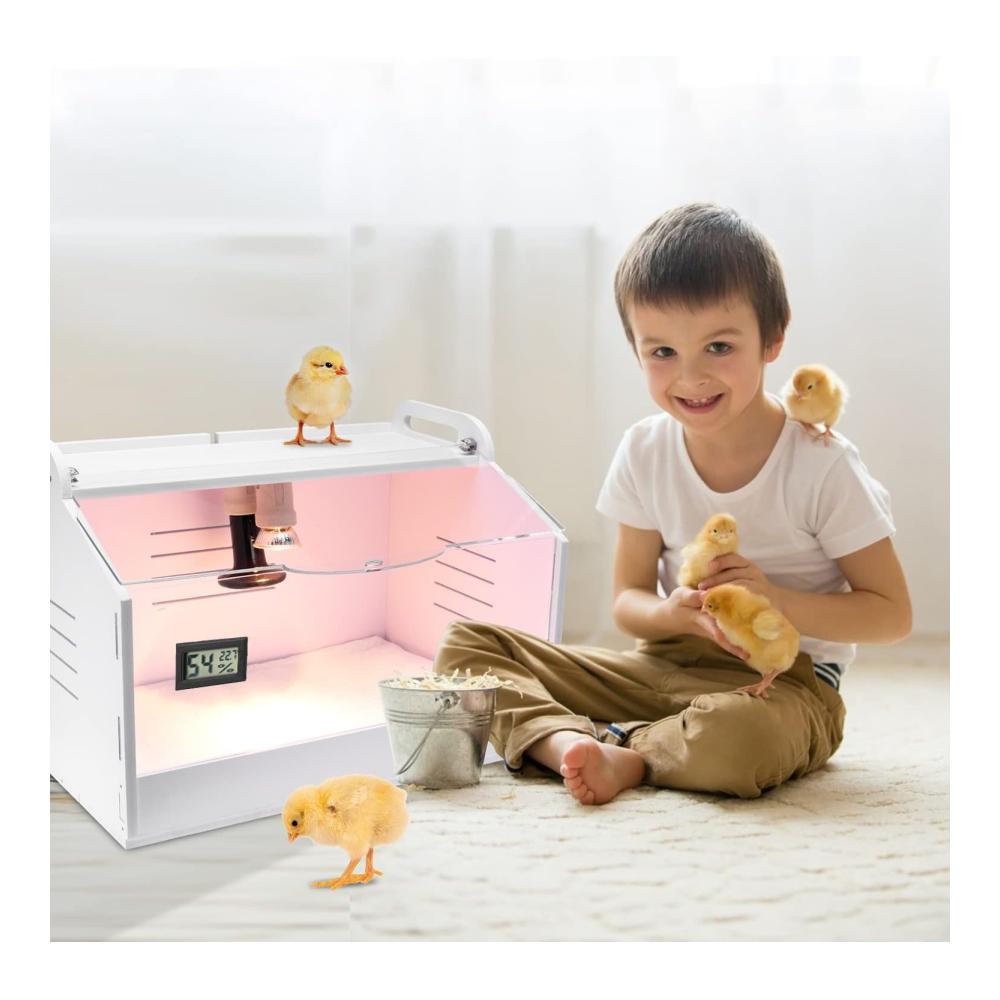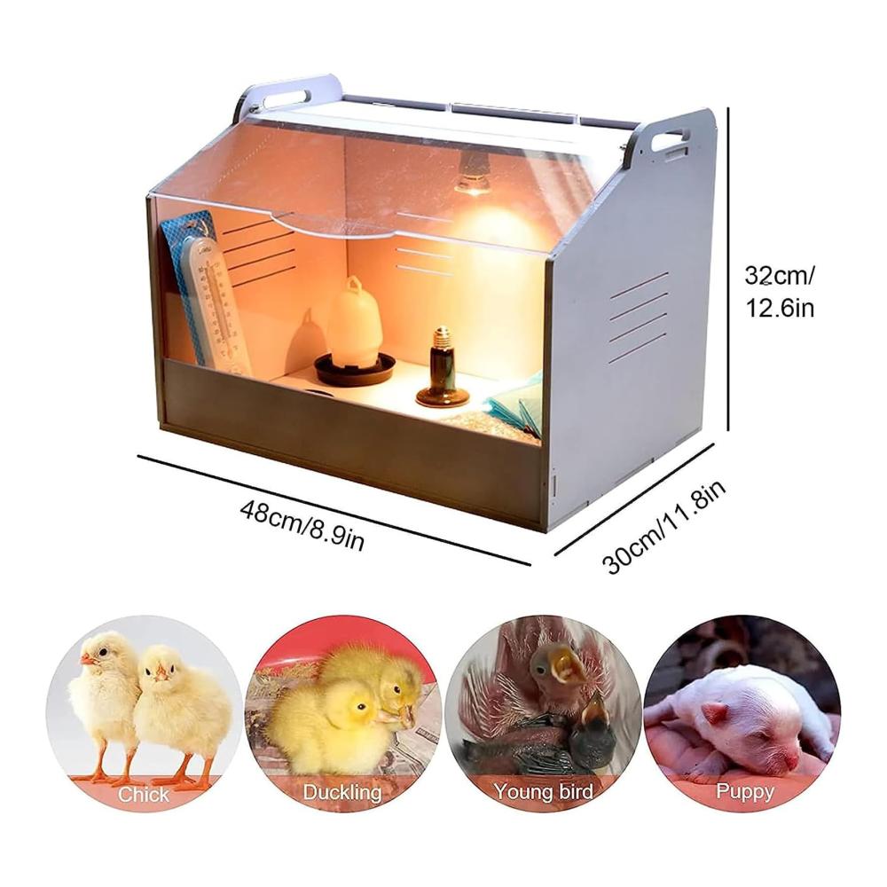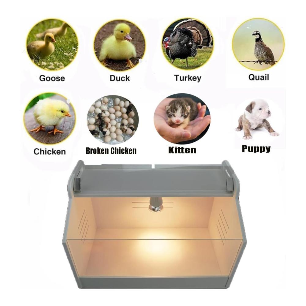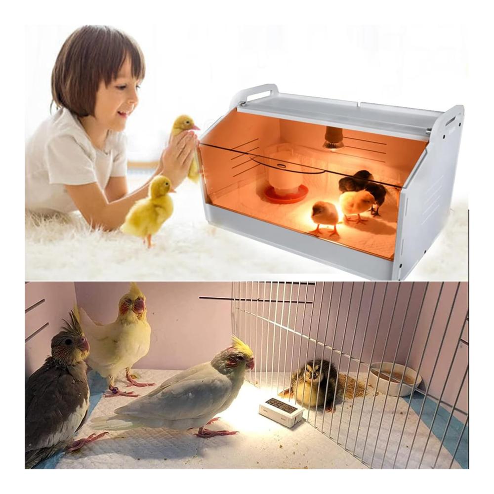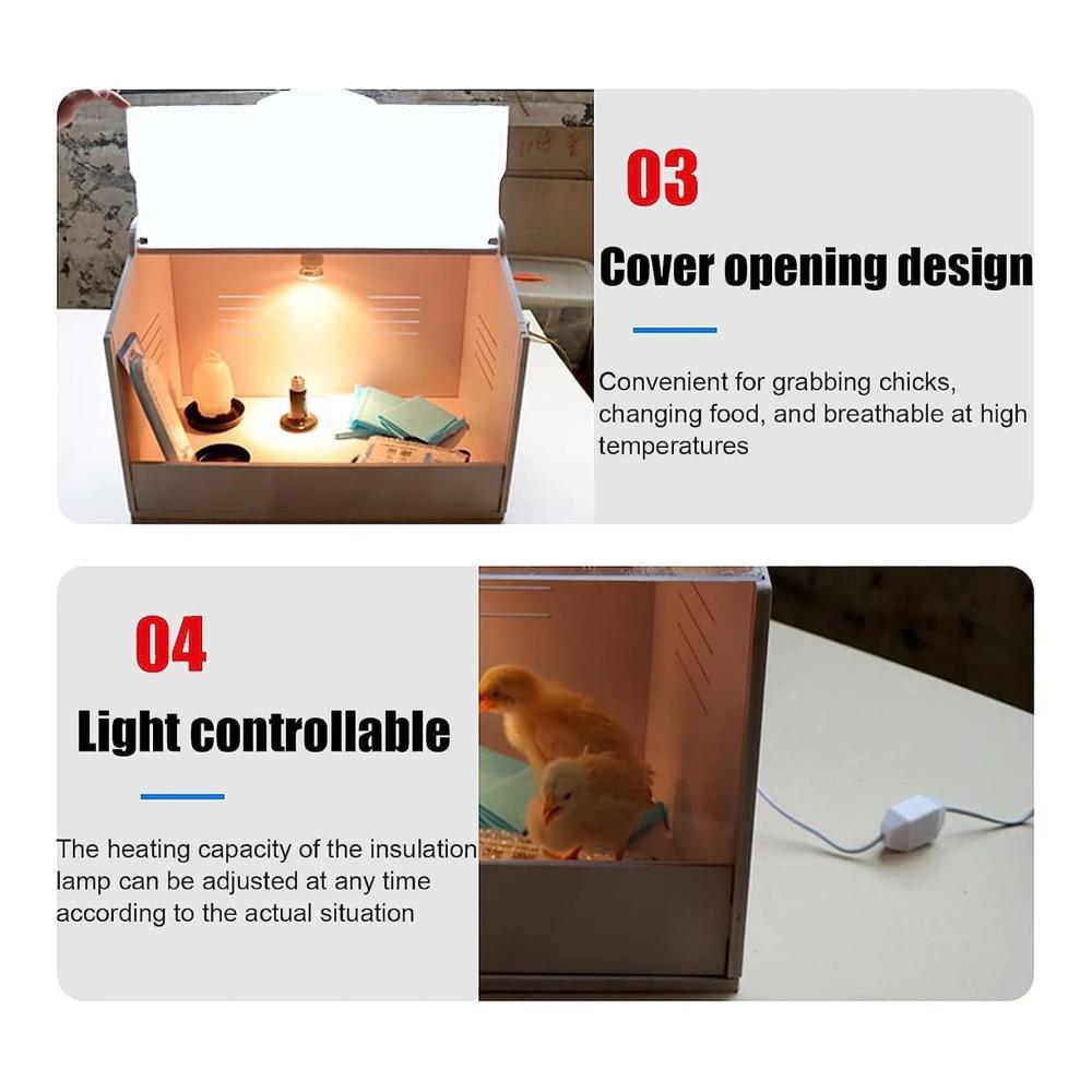 [Einstellbare Temperatur]: Sie können die Temperatur des Inkubators steuern, indem Sie die Helligkeit der Glühbirne mit dem stufenlosen Knopf entsprechend dem Status der Küken einstellen.Sonnenlicht wird verwendet, um die Küken mit Sonnenlicht zu versorgen und Keramiklichter werden verwendet, um die Küken warm zu halten.