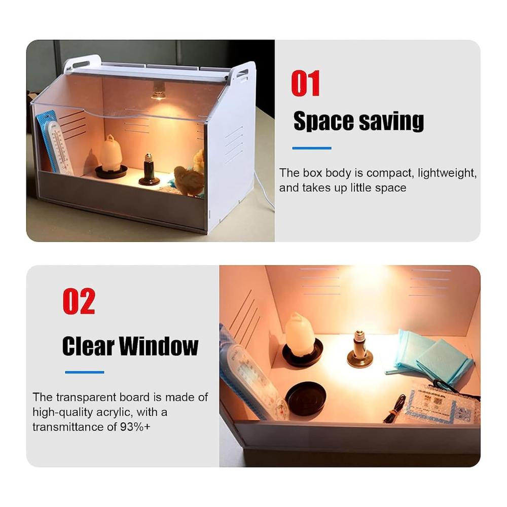 [Material]: Der Inkubator besteht aus hochtemperaturbeständiger Platte, die eine starke Tragfähigkeit und keine Verformung aufweist. Darüber hinaus eignet sich die transparente Acrylplatte besser für die tägliche Beobachtung von Kleintieren aus mehreren Blickwinkeln.