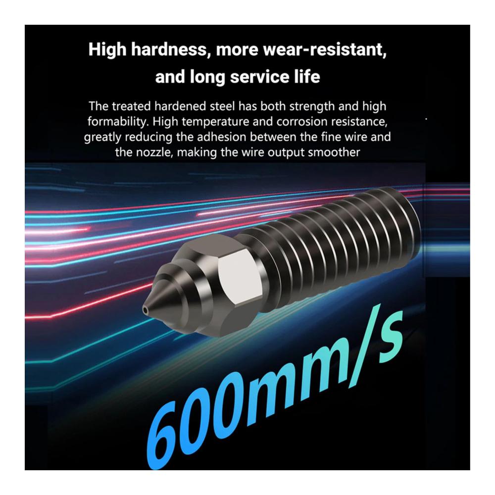 Hitzebeständig: Diese gehärteten Stahldüsen können Temperaturen von bis zu 450 °C standhalten, was schnelles Erhitzen und stetiges Drucken von Hochtemperatur-Filamenten ermöglicht.