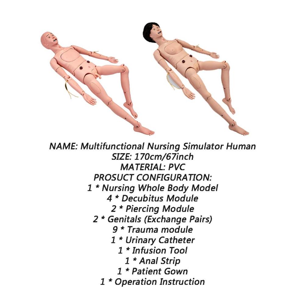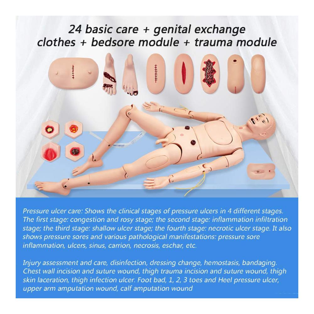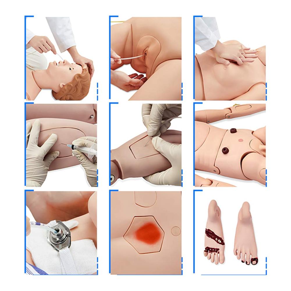 • Simulieren Sie die Patientenversorgung – die Trainingspuppe für Patienten ist lebensgroß, realistische Flexibilität der Gliedmaßen und Gelenke, verschiedene Positionen können realisiert werden, kann das Baden und Umziehen für Patienten im Bett simulieren. Helfen Sie dem Patienten bei der Umstellung auf die Methode am Krankenbett, auf den Rollstuhl, auf die Transportmethode im Flachwagen, auf der Trage und auf andere Methoden zum Bewegen und Tragen von Patienten. Achsendrehmet