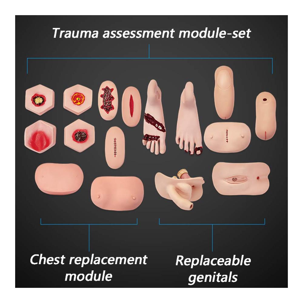 • Professionelles Trainingsdesign – Mit Hilfe unserer Patienten-Pflegepuppe können Sie verschiedene Pflegefähigkeiten, Dekubituspflege, Verletzungsbeurteilung und -pflege, Verbandwechsel, Blutstillung, Verband, Brustwandschnitt und Nahtwunde, Oberschenkeltrauma, Schnitt- und Nahtwunde üben , Hautriss am Oberschenkel, Geschwür mit Oberschenkelentzündung, schlechter Fuß, Druckgeschwür am 1., 2., 3. Zeh und an der Ferse, Amputationswunde am Oberarm, Amputationswunde an der Wade