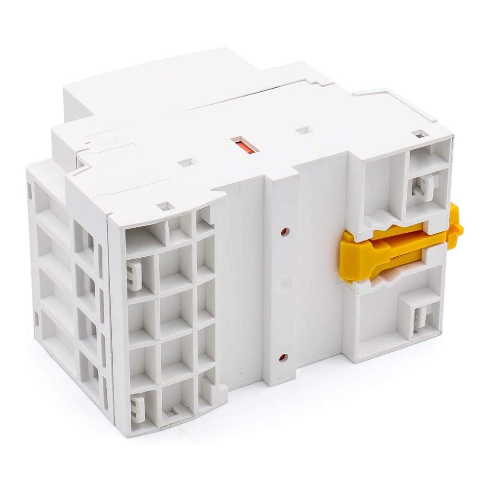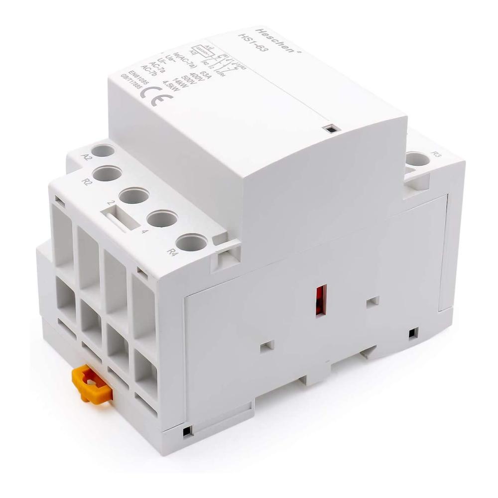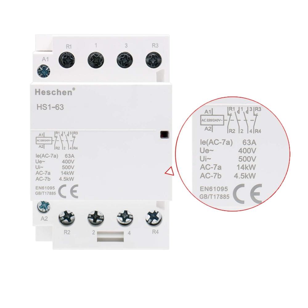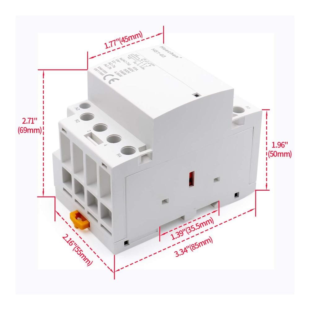 Produktname: Haushalts-Wechselstromschütz Nennleistung: 220 V/240 V AC, 63 A Kontaktart: 2NO 2NC, 4-polig Montageart 35 mm DIN-Schiene; Gesamtgröße (ca. ): 82 x 65 x 53 mm (L x B x T) Nettogewicht: 352 g
