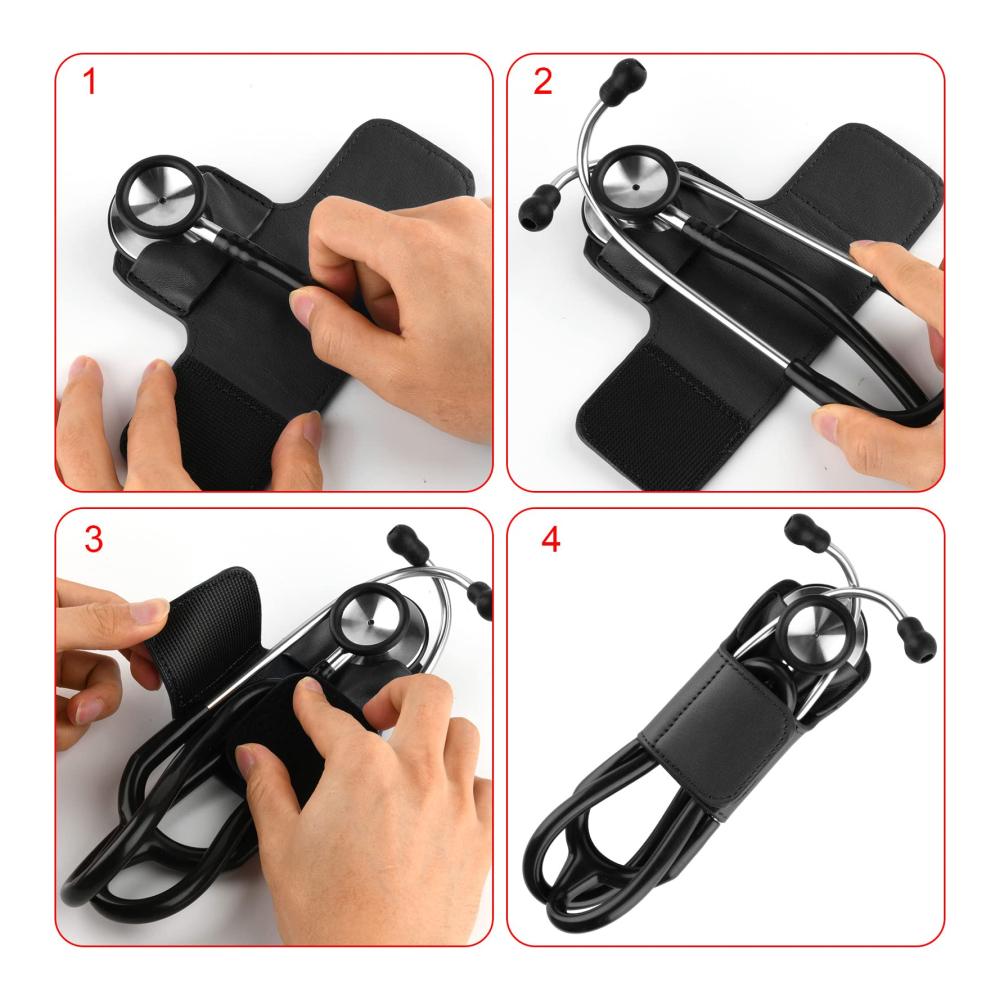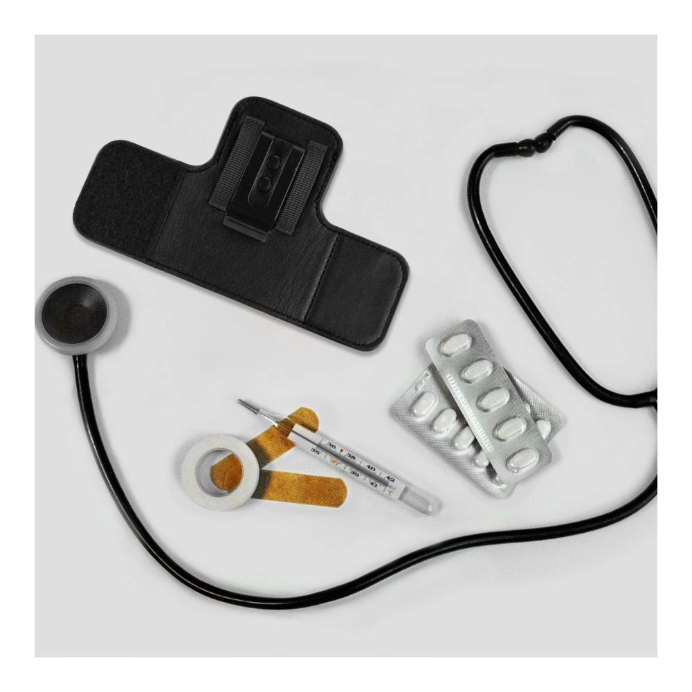 Klettverschluss hält Ihr Stethoskop sicher neben Ihrer Hilfe, ein Metallclip befestigt den Stethoskophalter fest an Ihrem Gürtel oder Ihrer Hose.