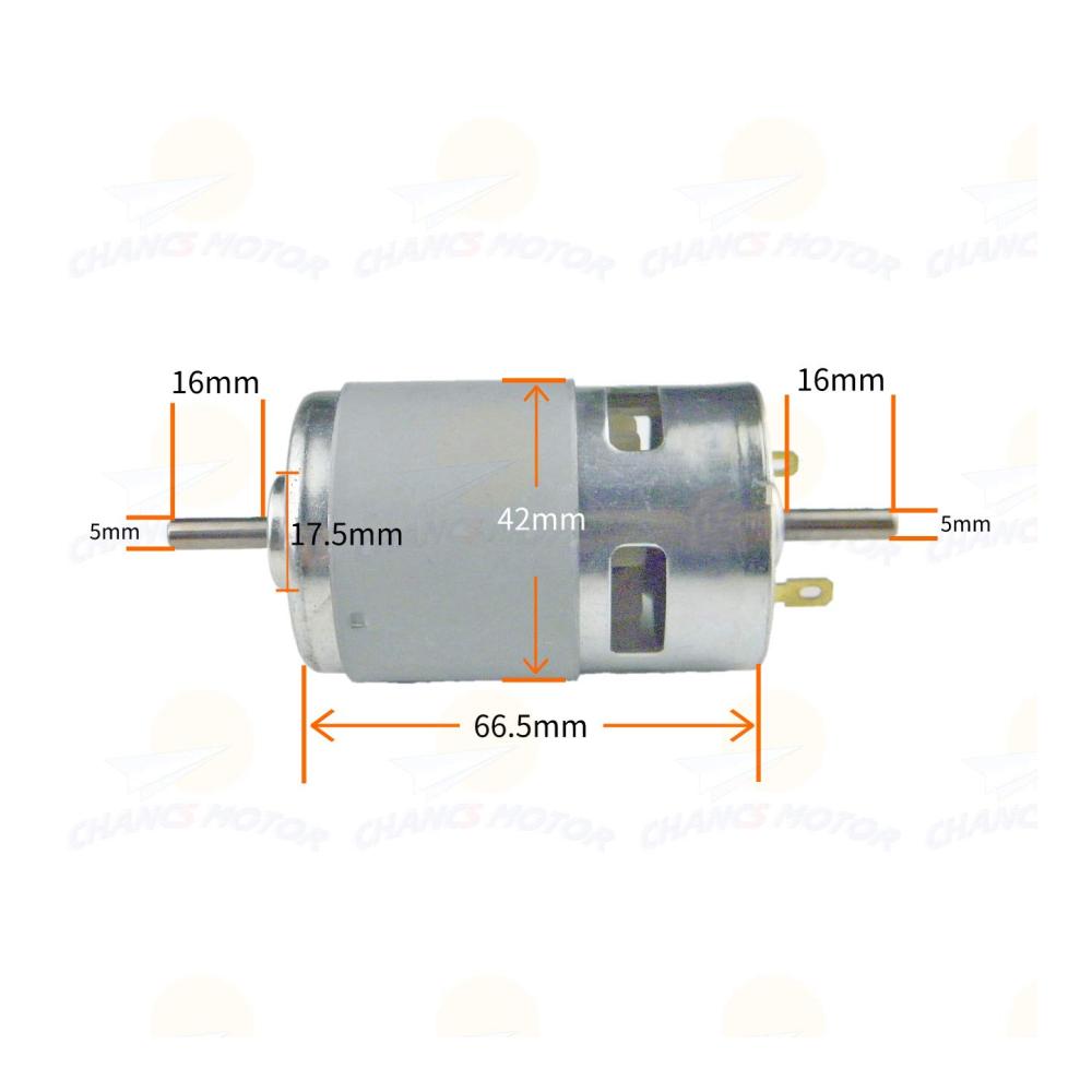 • *Die Spezifikation des Motors: Nennspannung: DC 12V, Geschwindigkeit: 6000RPM; Nennspannung: DC 24V, Geschwindigkeit: 12000RPM; Durchmesser des Motorkörpers: 42mm; Länge des Motorkörpers: 66.5mm; Wellentyp: Doppelwelle; Wellenlänge: 16mm; Wellendurchmesser: 5mm.