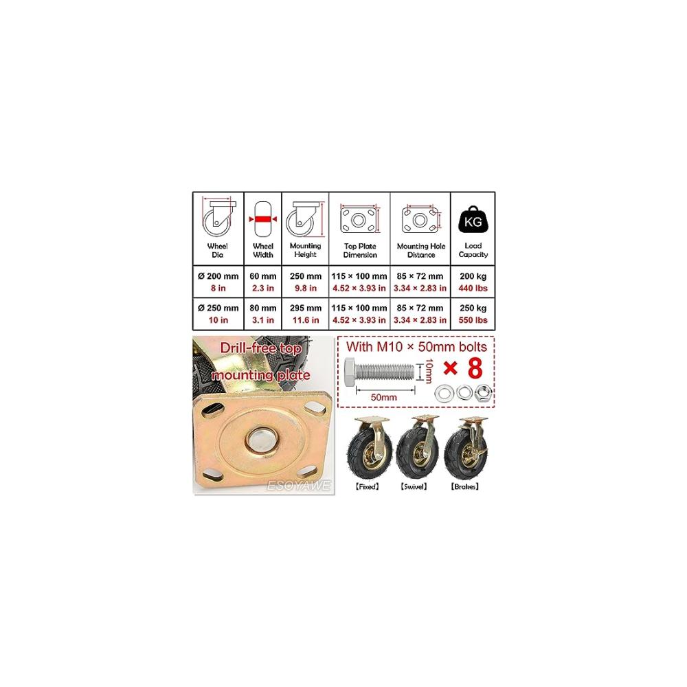200-mm-/250-mm-Hochleistungs-Pneumatik-Gummirollen werden für verschiedene industrielle Transportplattformen verwendet, was den Personalaufwand reduzieren, das Bewegen von Objekten erleichtern und die Effizienz verbessern kann. 10 Lagen verdickter Stahldraht-Gummiräder sorgen für die verschleißfeste, stoßdämpfende und rutschfeste Leistung der Rollen.🛞 Produkteinführung- Name: Heavy Duty Rubber Caster Wheel- Material: Gummi Stahl- Typ: Bockrollen/Lenkrollen/Bremsrollen- Verwendung: Wagen, Werkzeugkasten, leichte Maschinen, Geräteträger, mobiler Arbeitsplatz, Schrank, Möbel usw .🛞 Detaillierte Abmessungen der Rollen- Raddurchmesser: 200 mm (8 Zoll) / 250 mm (10 Zoll)- Radbreite: 60 mm (2,36 Zoll) / 80 mm (3,14 Zoll)- Montagehöhe: 250 mm (9,84 Zoll) / 295 mm (11,6 Zoll)- Belastbarkeit: 200 kg (440 lbs) / 250 kg (550 lbs)- Dicke der Halterung: 6 mm (0,23 Zoll)- Größe der oberen Platte: 11,5 cm × 10 cm (4,52 Zoll × 3,93 Zoll)- Abstand der Montagelöcher: 8,5 cm × 7,2 cm (3,34 Zoll). × 2,83 Zoll)🛞 Packungsinhalt:Pneumatische Gummirollen * 2 M10 × 50 Schrauben * 8🛞 Achtung- Falls vorhanden Bei Fragen kontaktieren Sie uns bitte vor oder nach dem Verkauf- Die Rollen sind nur für den menschlichen Antrieb geeignet, die Verwendung von Autos oder Elektrofahrzeugen ist verboten- Die Tragfähigkeit von 4 Rollen ist die Summe der Tragfähigkeit Von 3 Rollen