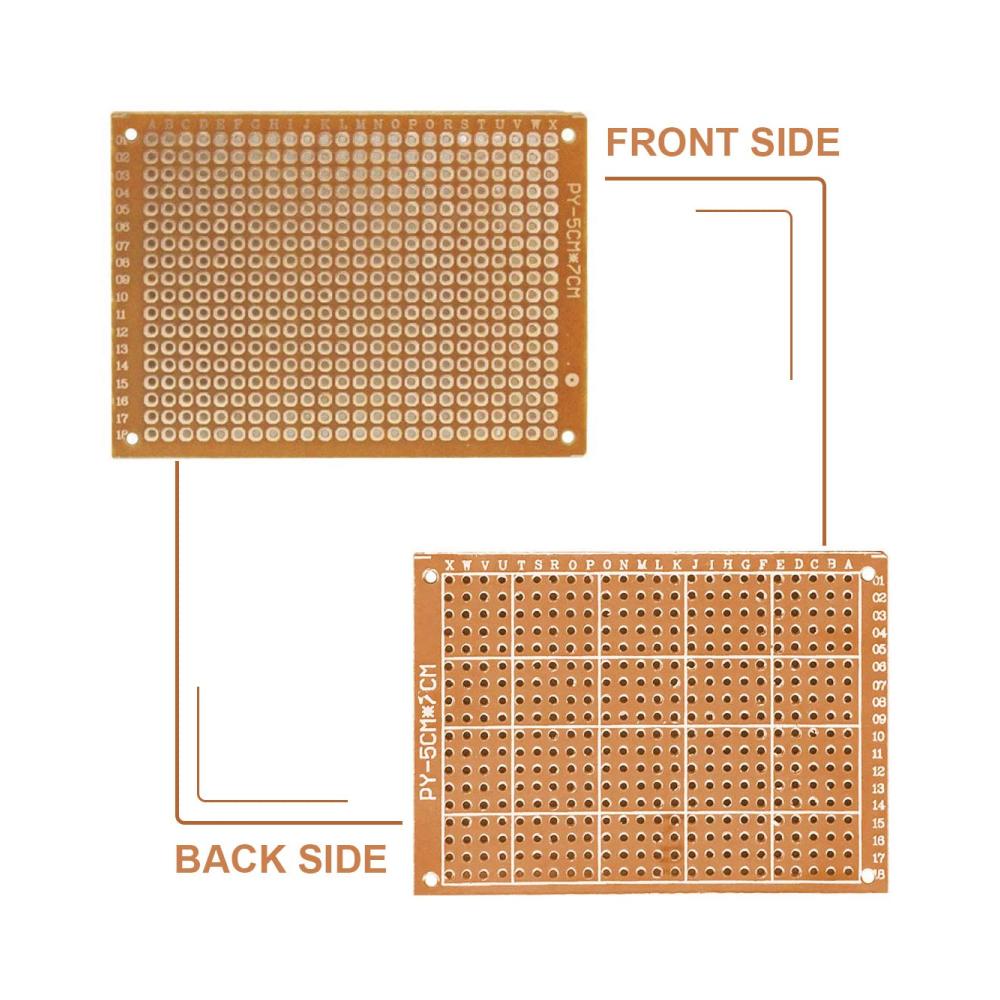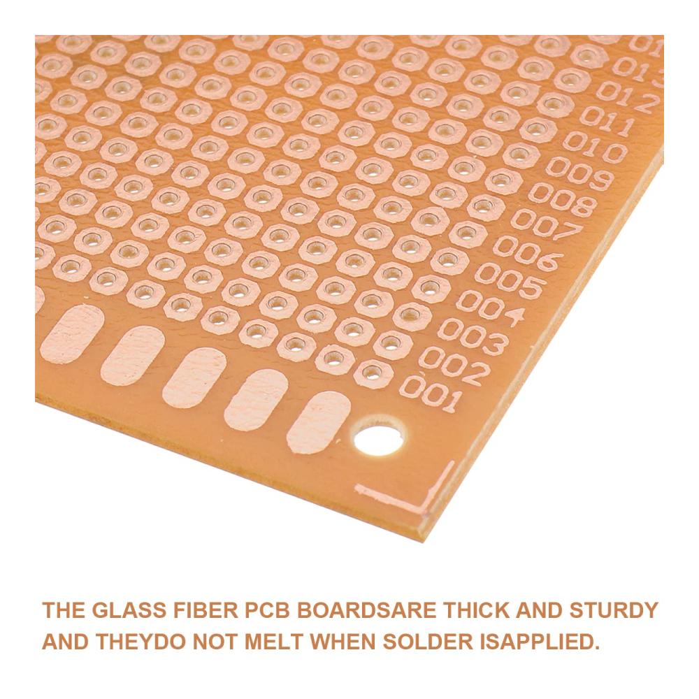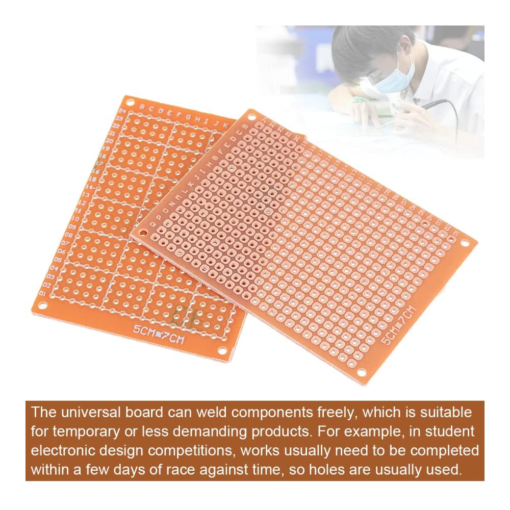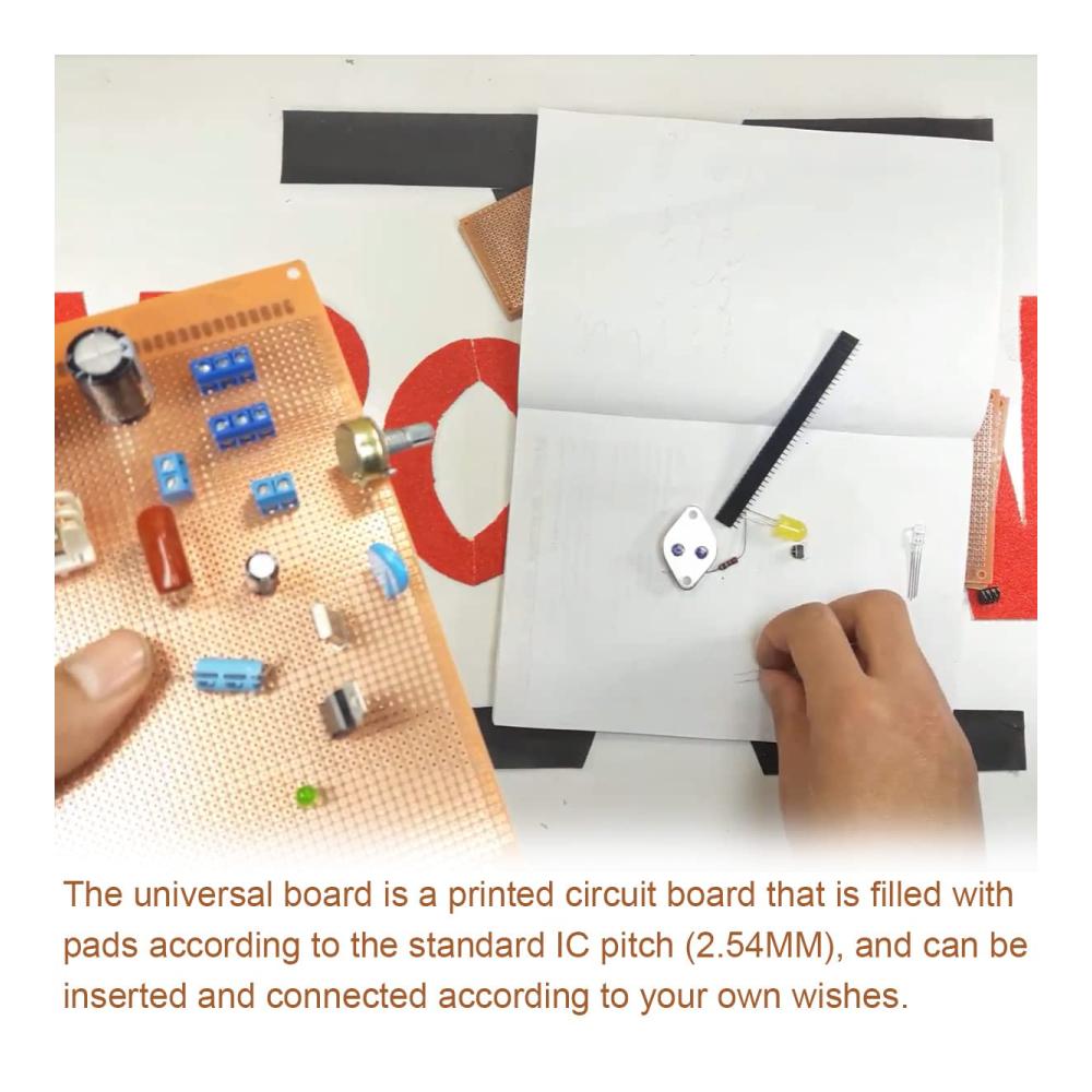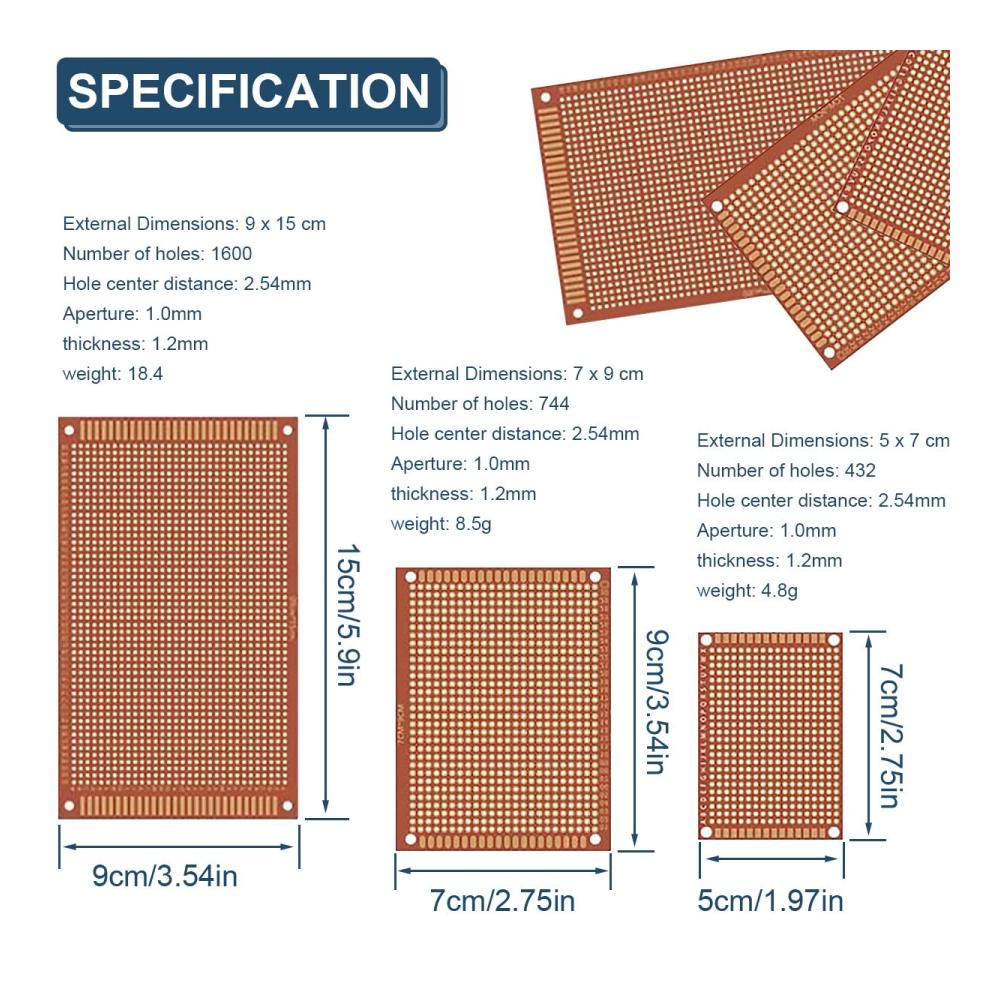 Product specifications: Substrate material: 94HB electric wood glue plate Colour: brown Thickness (approx.): 1.2mm Hole Diameter (approx.): 1mm Hole Pitch (approx.): 2.54mm 5 x 7 cm universal circuit board Number of holes: 432 Size (approx.): 5 x 7 cm 7 x 9 cm universal circuit board Number of holes: 720 Size (approx.): 7 x 9 cm 9 x 15 cm universal circuit board Number of holes: 1600 Size (approx.): 9 x 15 cm Product features: Circuit boards are widely used in electronic experiments and point-to-point DIY soldering projects. With perfectly designed pre-plated copper holes on the board, you can easily install all necessary sensors and components. Good to meet your construction requirements. Package includes: 5Pcs 5 x 7 cm universal circuit board 5Pcs 7 x 9 cm universal circuit board 5Pcs 9 x 15 cm universal circuit board 5Pcs Male Single Row 40 Pin Header 5Pcs Female Single Row 40 Pin Header