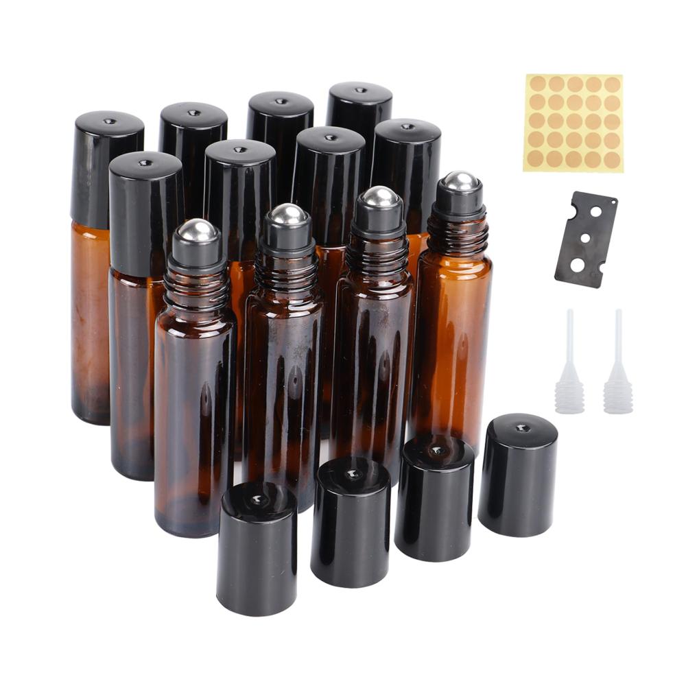 Hochwertige Tropfflaschen-Set TECDW Roll On Glasflaschen für Ätherisches Öl – 12x 10ml Braune Roll On Flasche – Mit Edelstahl-Roller Öffner Etiketten Pipetten – Perfekt für ätherische Öle und Lotionen